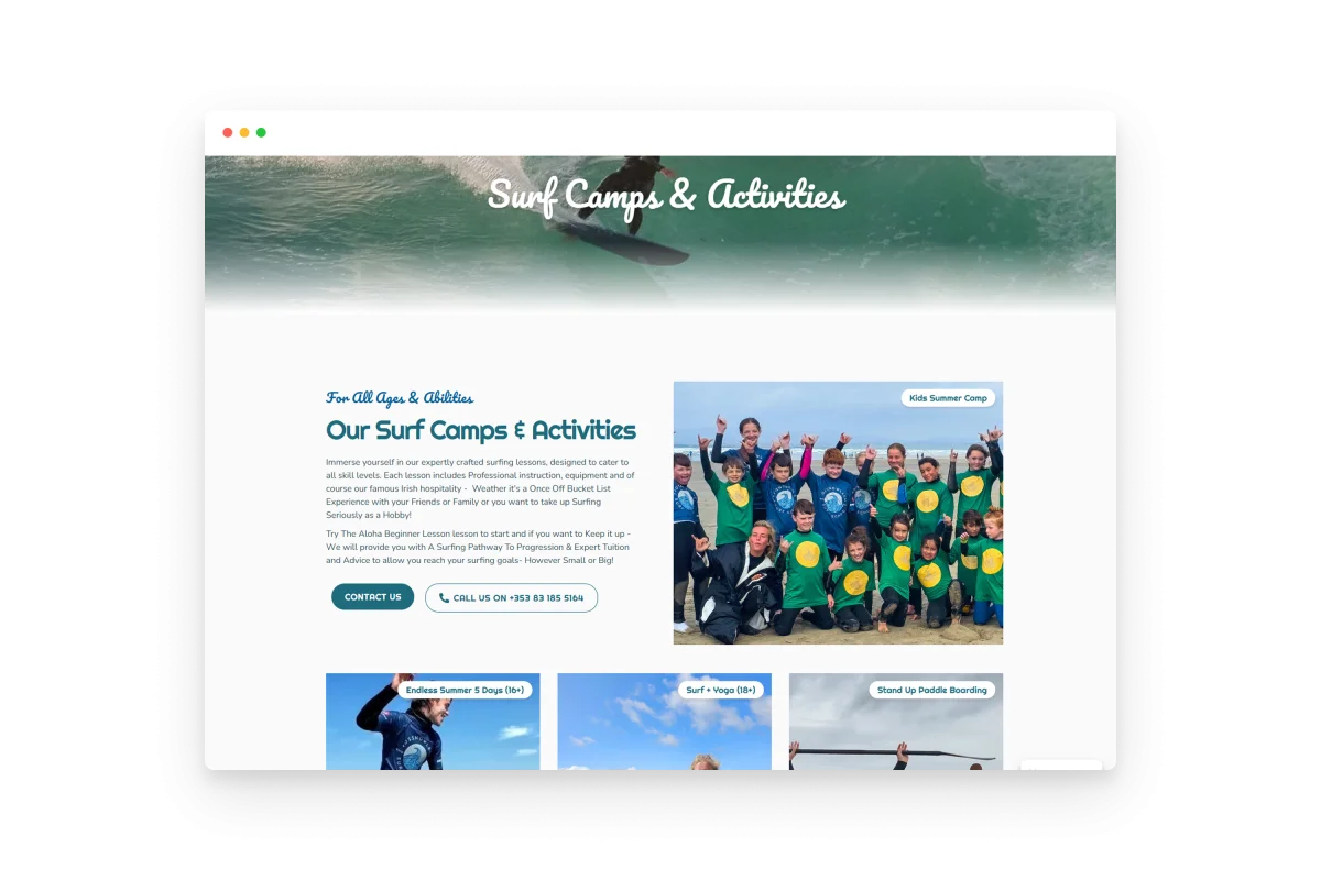The surf school also recognised the critical importance of digital accessibility in the tourism industry, particularly given their commitment to becoming one of Ireland's most inclusive surf schools. They needed a platform that would be fully accessible to users with disabilities, ensuring compliance with WCAG 2.2 AA standards whilst still delivering an engaging visual experience that showcased the spectacular Rossnowlagh beach location. Additionally, they required integrated e-commerce functionality to sell surfboards, equipment, and accessories through their surf shop, along with the ability to offer digital gift cards - a growing revenue stream in the experience economy.