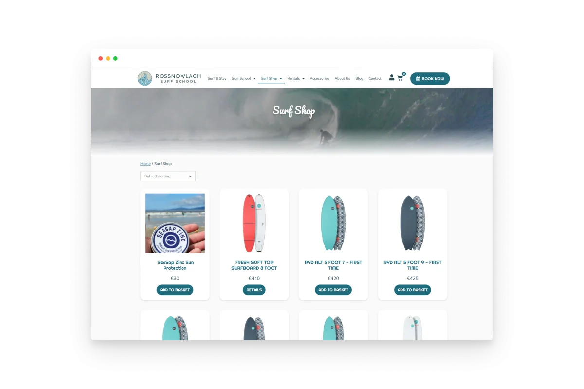 We delivered a comprehensive WordPress web design solution that combines advanced booking functionality with e-commerce capabilities, specifically tailored for Rossnowlagh Surf School's diverse offerings. The platform seamlessly integrates surf lesson bookings for everything from beginner Aloha sessions to 5-day intensive courses and large group adventures, whilst also providing a full-featured online surf shop selling surfboards, equipment, and accessories. Our development team created custom booking systems that handle the complexity of scheduling individual lessons, multi-day camps, and equipment rentals, all with automated confirmation processes and digital gift card functionality.